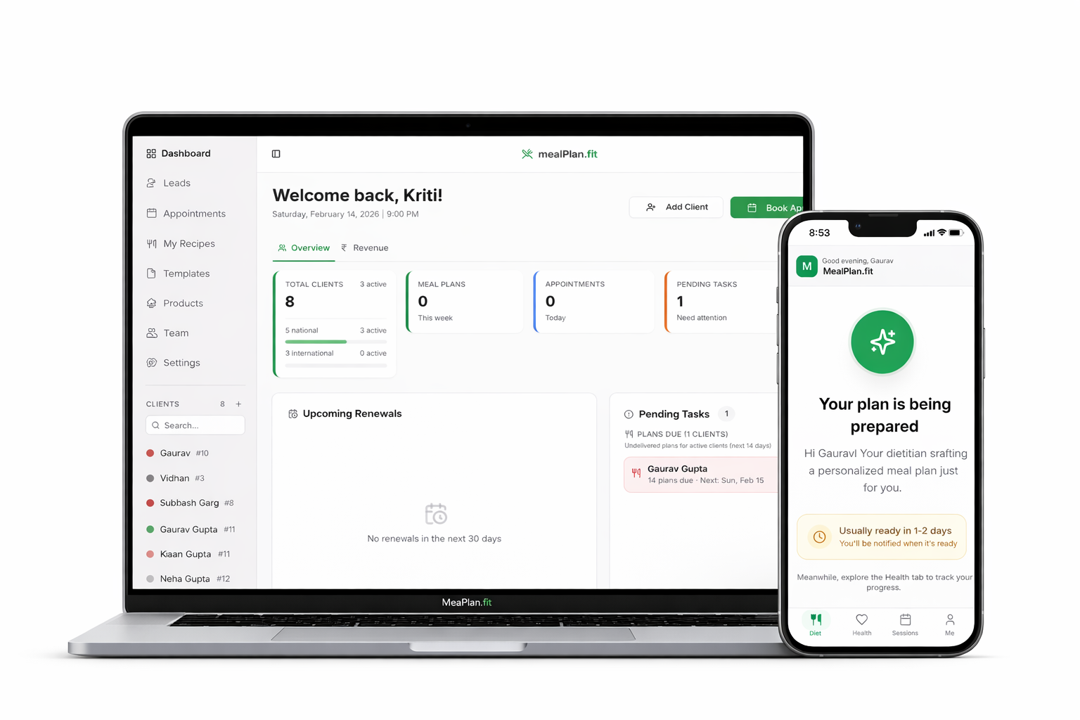 Manage your entire nutrition practice — capture leads, book appointments, onboard clients, create diet plans, analyze lab reports, manage your team, sell products, and track growth.